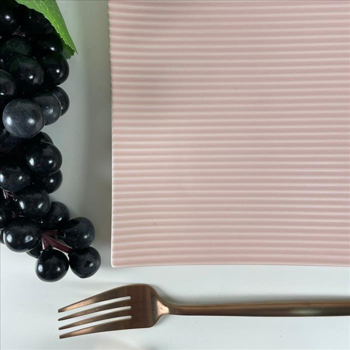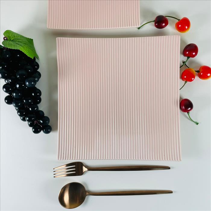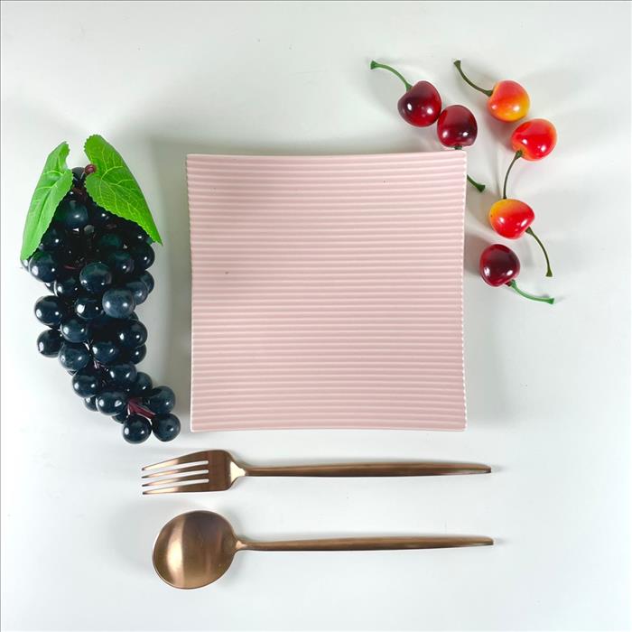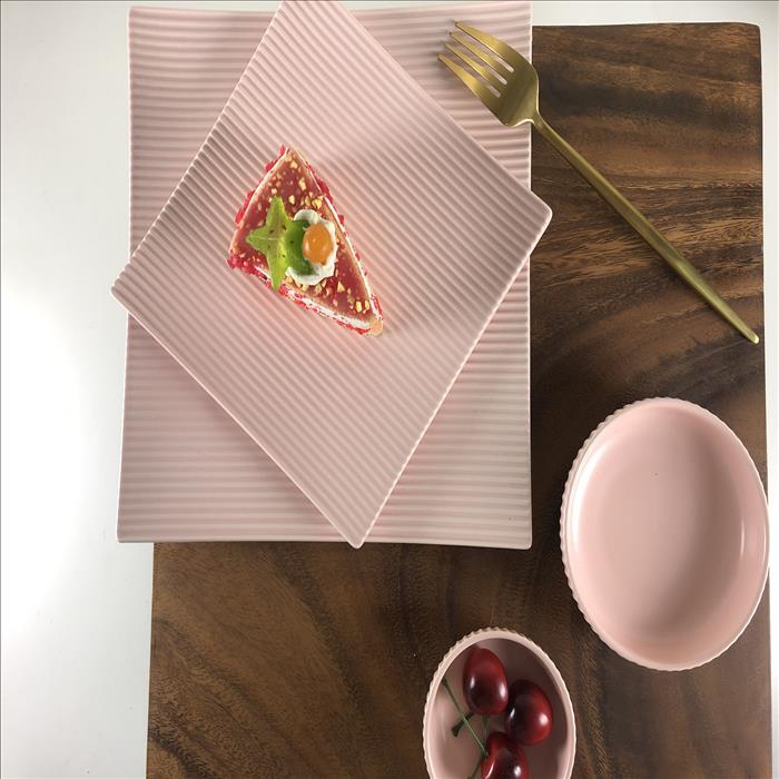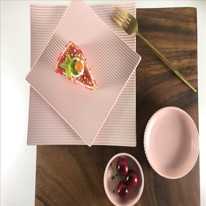 套裝餐具 正方形條紋啞光絨盤、咖啡杯、小菜碟(大.小) 粉色