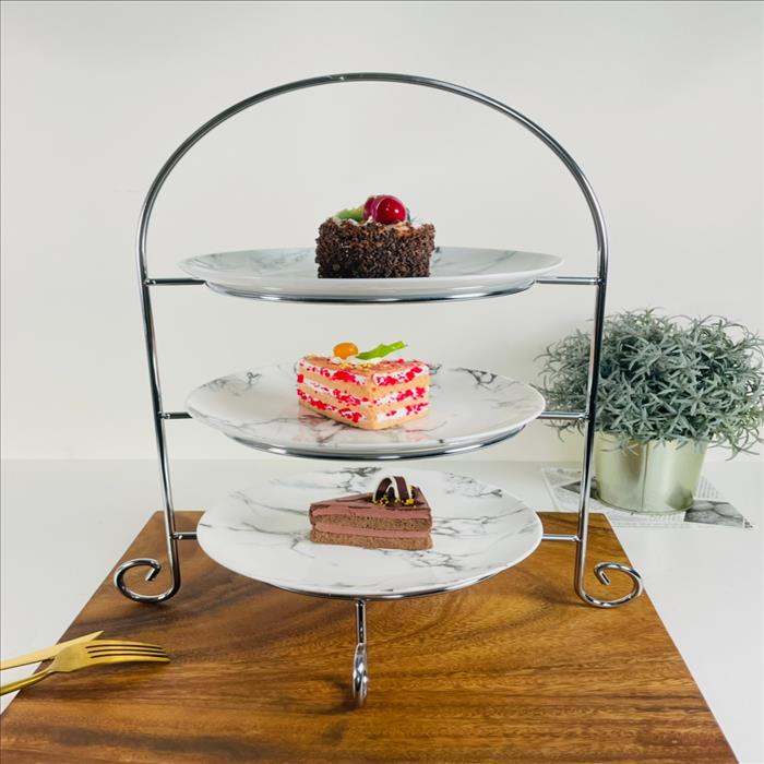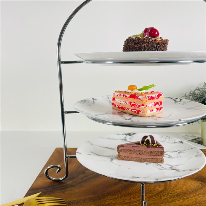 經典三層圓形點心盤架搭8吋大理石紋盤/蛋糕架/點心架/下午茶架/亮銀色