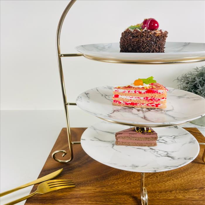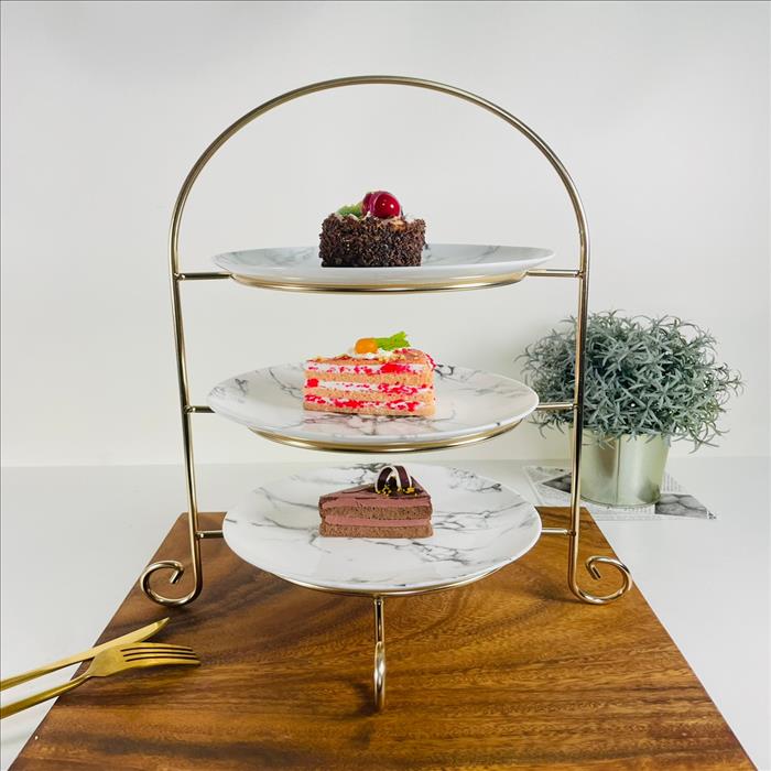 經典三層圓形點心盤架搭8吋大理石紋盤/蛋糕架/點心架/下午茶架/亮金色