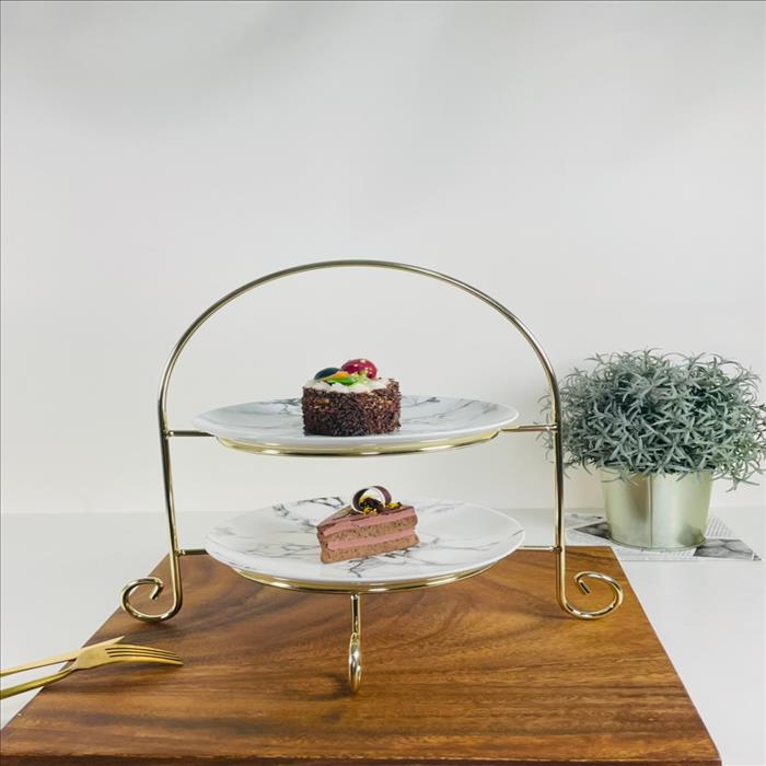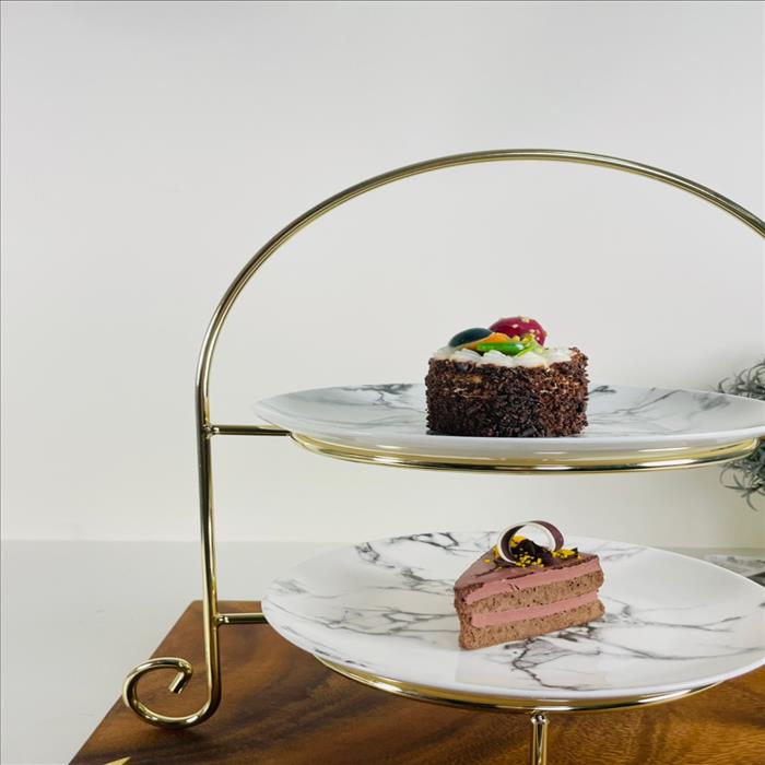 經典雙層圓形點心盤架搭8吋大理石紋盤/蛋糕架/點心架/下午茶架/亮金色