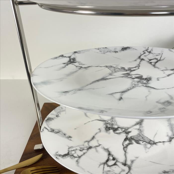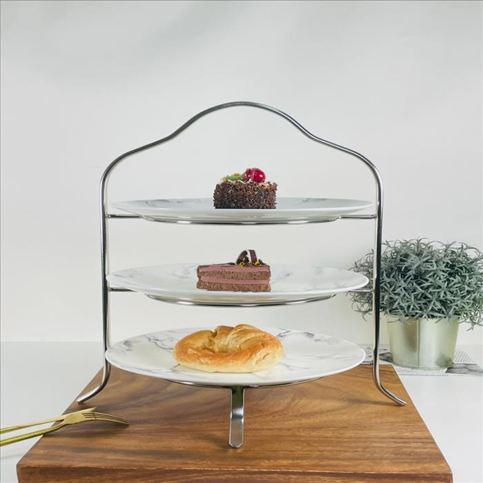英式扁線三層下午茶架搭大理石紋盤/蛋糕架/點心架/下午茶架/(矮款)/亮銀色
