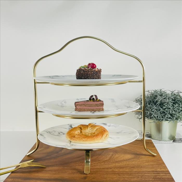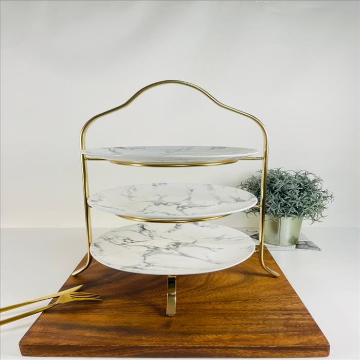 英式扁線三層下午茶架搭大理石紋盤/蛋糕架/點心架/下午茶架/(矮款)/亮金色