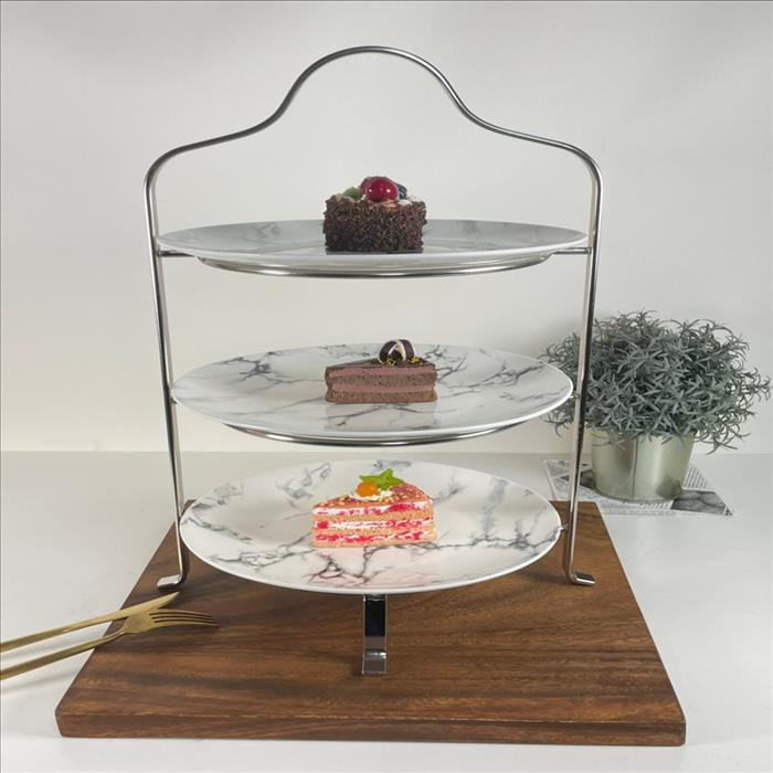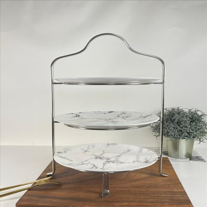 英式扁線三層下午茶架搭大理石紋盤/蛋糕架/點心架/下午茶架/(高款)亮銀色