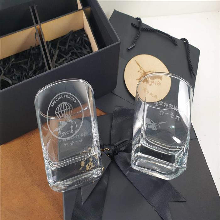 玻璃杯雕刻 四方威士忌酒杯 雙入禮盒 可刻名字 LOGO 附禮盒紙袋 木質賀卡
