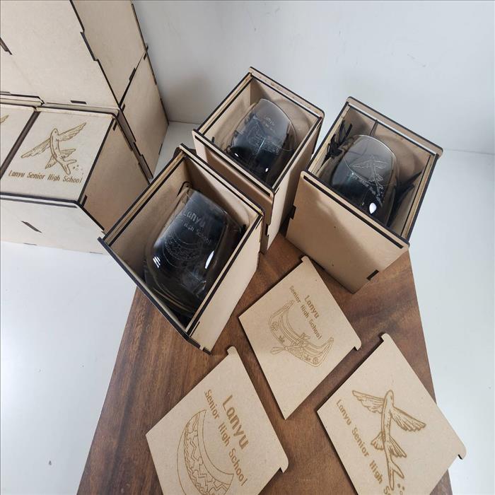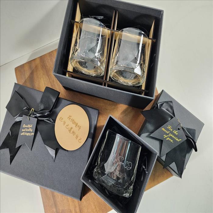 玻璃杯雕刻 旋轉威杯 雙入禮盒 不倒翁威士忌杯 可刻名字 LOGO 附禮盒紙袋 木質賀卡