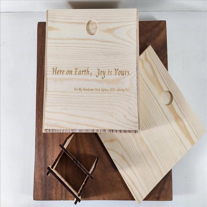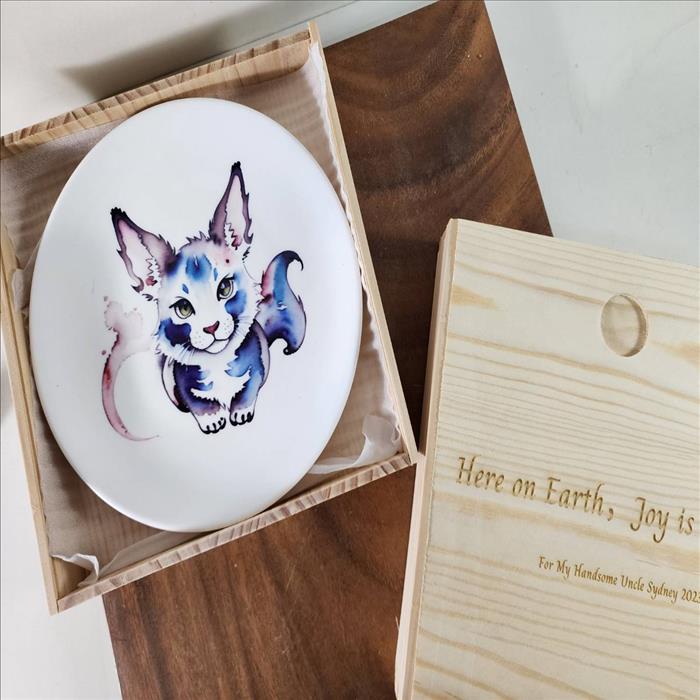 8吋 純白強化陶瓷圓盤 訂製圖案印刷 松實木盒單入裝附木架