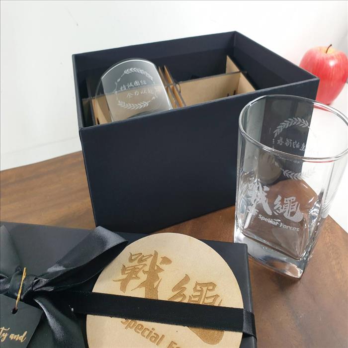 玻璃杯雕刻 四方威士忌酒杯 雙入禮盒 可刻名字 LOGO 附禮盒紙袋 木質賀卡