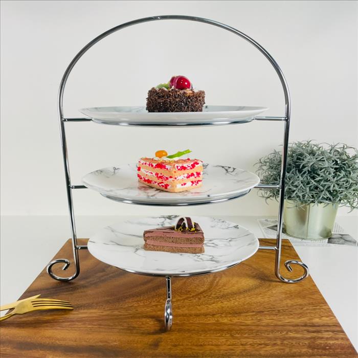 經典三層圓形點心盤架搭8吋大理石紋盤/蛋糕架/點心架/下午茶架/亮銀色