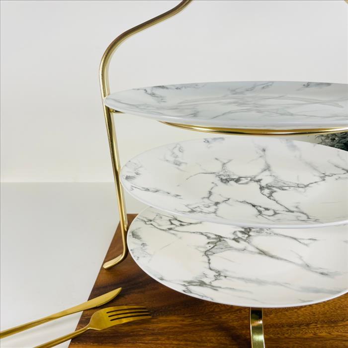 英式扁線三層下午茶架搭大理石紋盤/蛋糕架/點心架/下午茶架/(矮款)/亮金色
