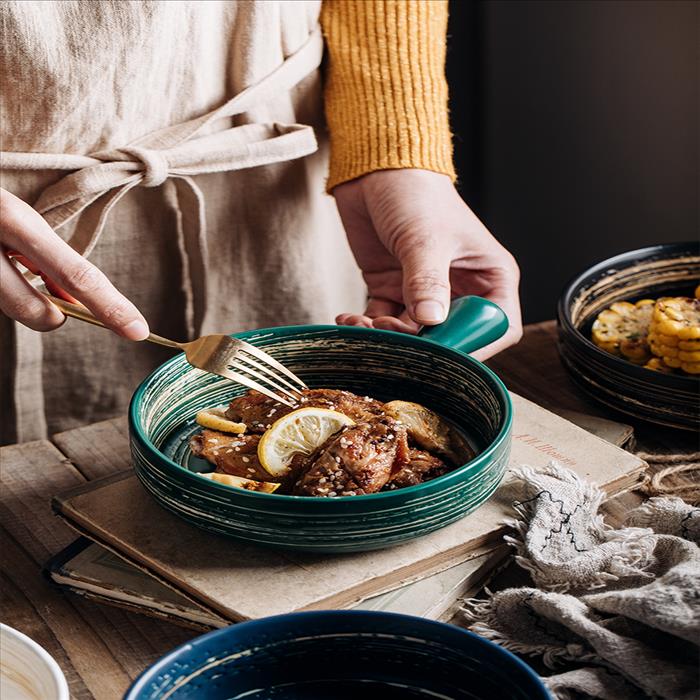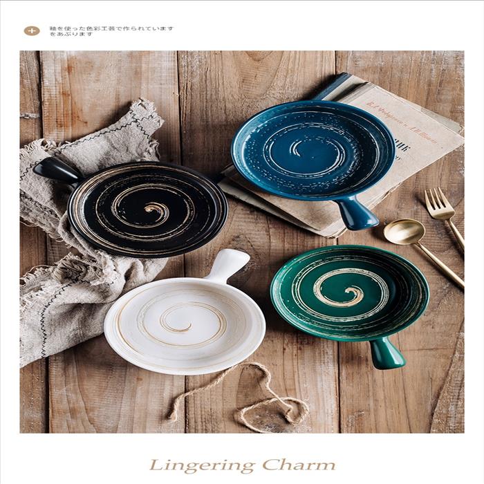 北歐風 帶手柄創意烤碗/烘焙碗/烤箱專用焗飯碗 , 創意陶瓷西餐盤 居家餐廚擺設 質感裝飾 條紋淺盤 可訂製專屬禮盒 柚木紋刀叉盒 可雷雕logo , 古樸自然花型粗陶浅盤菜盤點心盤咖啡廳